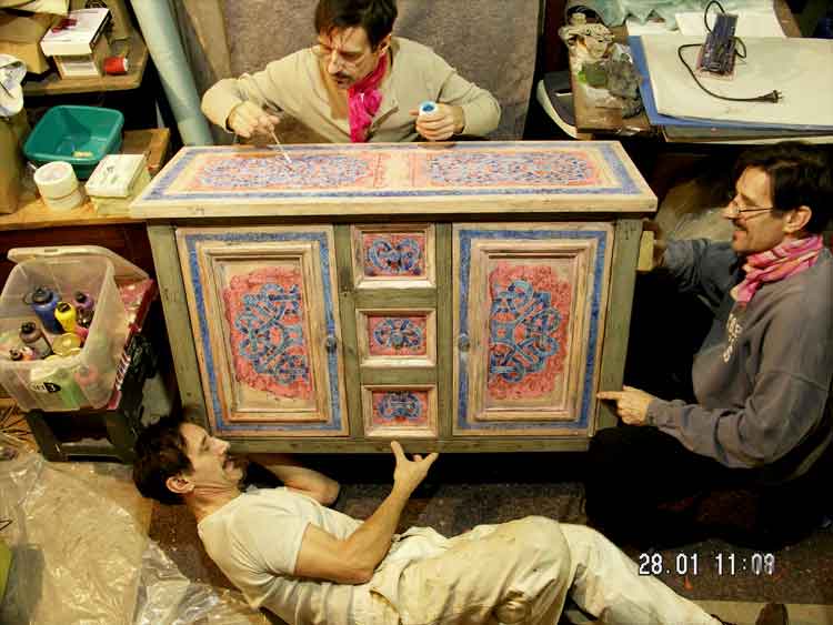 Nous venons chercher les meubles à votre domicile et réalisons suivant la maquette ou le dessin, un décor avec notre savoir-faire; lettrage, simulation de vieilles enseignes, nous privilégions les motifs celtes. Technique : Après le décapage, les différentes couches de peinture sont superposées suivant la technique traditionnelle du « gras sur maigre ». |